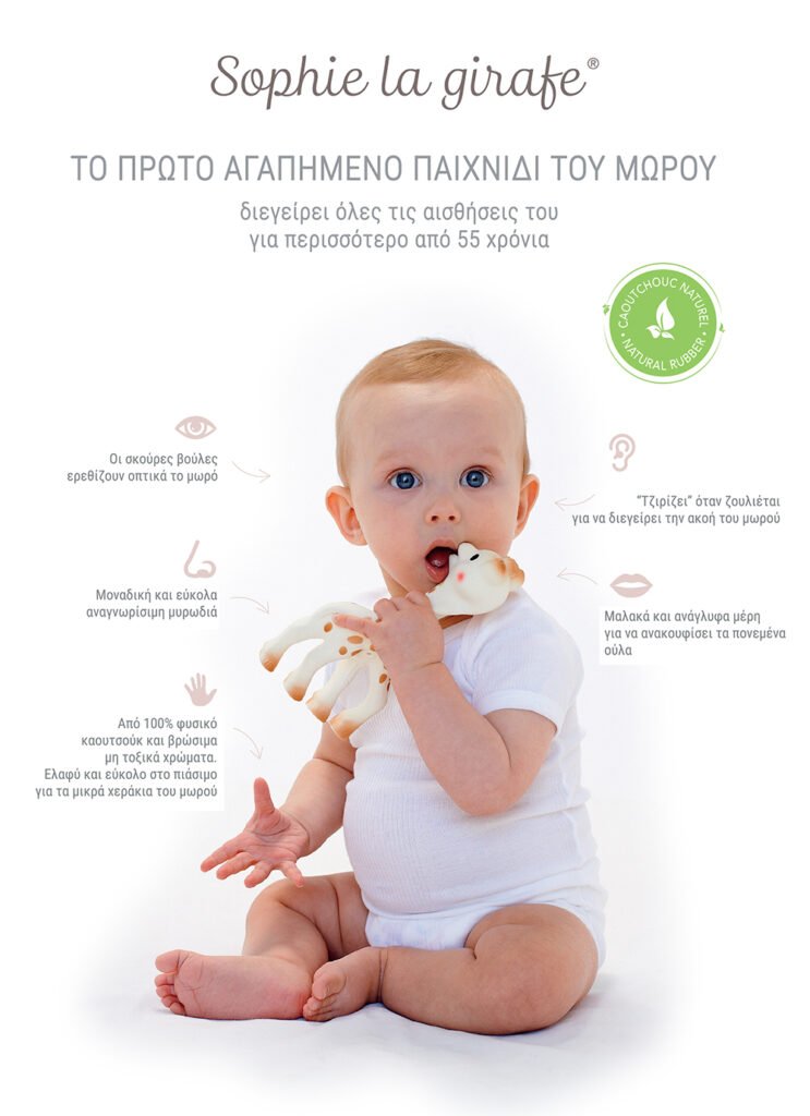 Η Σόφι η καμηλοπάρδαλη αποτελεί γενικά το πιο όμορφο και διάσημο παιχνίδι στον κόσμο που διεγείρει όλες τις αισθήσεις του μωρού!!! Η Σόφι γεννήθηκε στο Παρίσι το 1961 και από τότε έχει κατακτήσει όλο τον κόσμο!