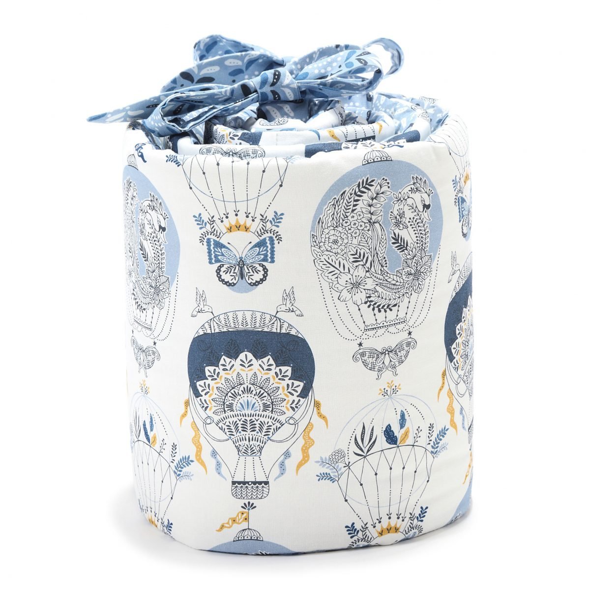 Το βαμβακερό προστατευτικό κούνιας διπλής όψης έχει συνολικό μήκος 2,10 μέτρα (70x70x70cm) και ύψος 25cm. Το συγκεκριμένο έχει άσπρο και μπλε χρώμα, το οποίο έχει ένα υπέροχο σχέδιο με αερόστατα!