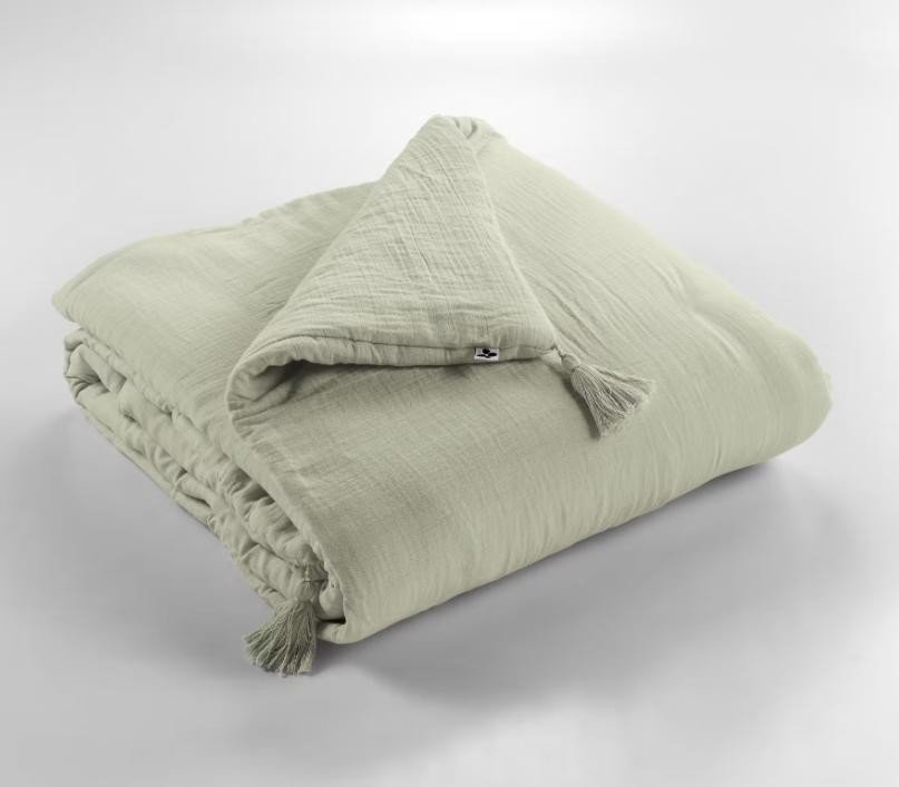Το συγκεκριμένο παπλωματάκι είναι φτιαγμένο εξωτερικά από βαμβακερή μουσελίνα, με γαζωμένα πουά ίδιου χρώματος και με μικρές φουντίτσες στις άκρες του. Στο εσωτερικό του εμπεριέχεται υπο αλλεργική βάτα σιλικόνης.