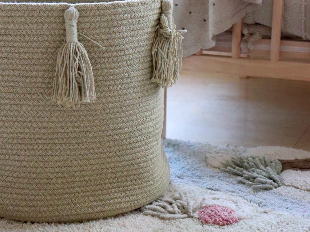 A multi-purpose basket for everything! Very versatile and designed to match the entire Cotton Woods collection as well as the previous collections. It has finishes in bicolour cotton melange braided cord (in light and dark olive green) to achieve a changing effect, like with nature’s hues. It comes in the ideal size to store and organize allsorts of objects, and is finished with decorative handmade tassels along the edge.