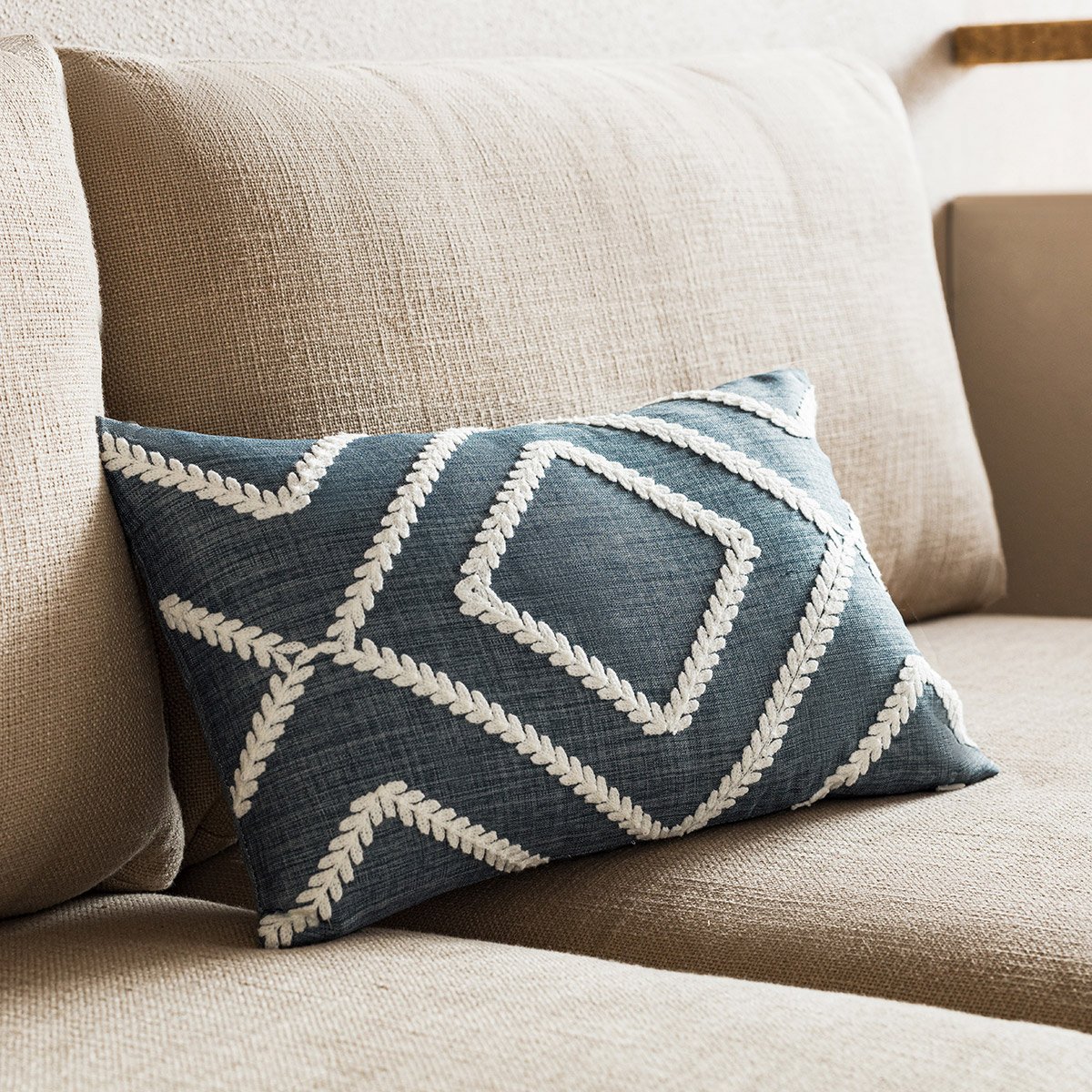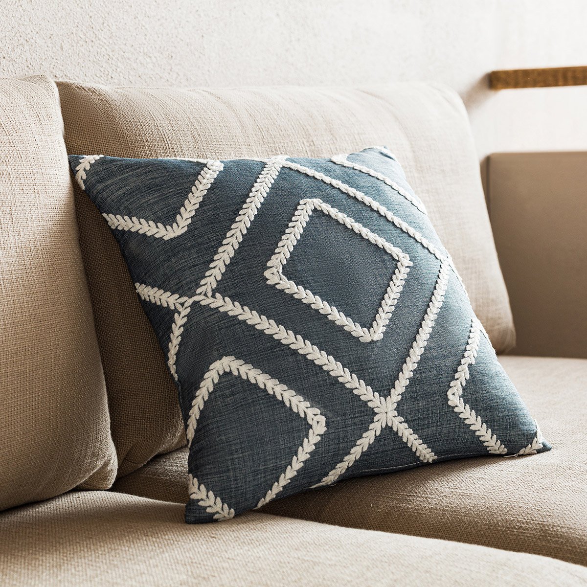Στο διακοσμητικό μαξιλάρι Fabio αποτυπώνεται ένα κεντημένο κλασσικό σχέδιο σε τύπου λινό ύφασμα.
