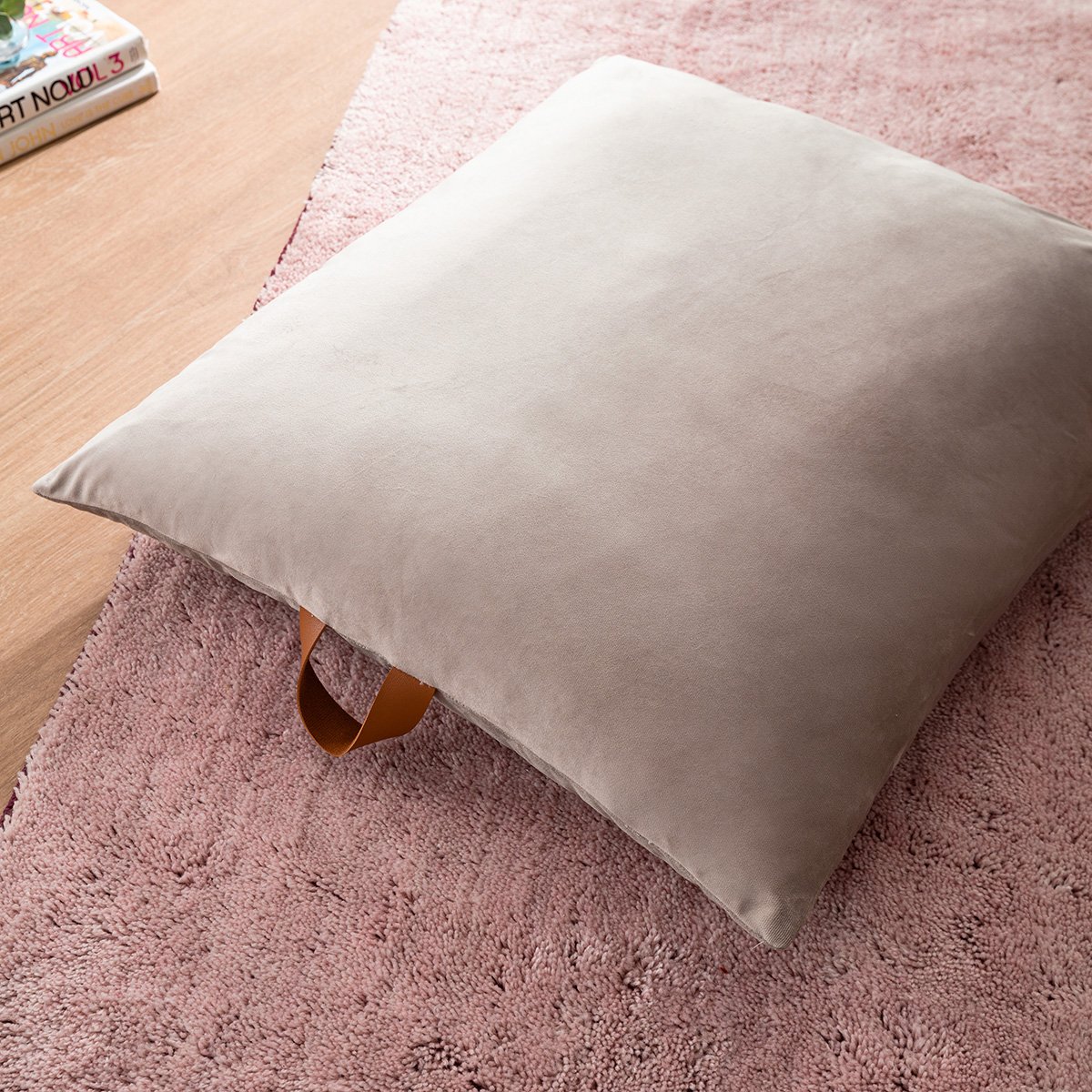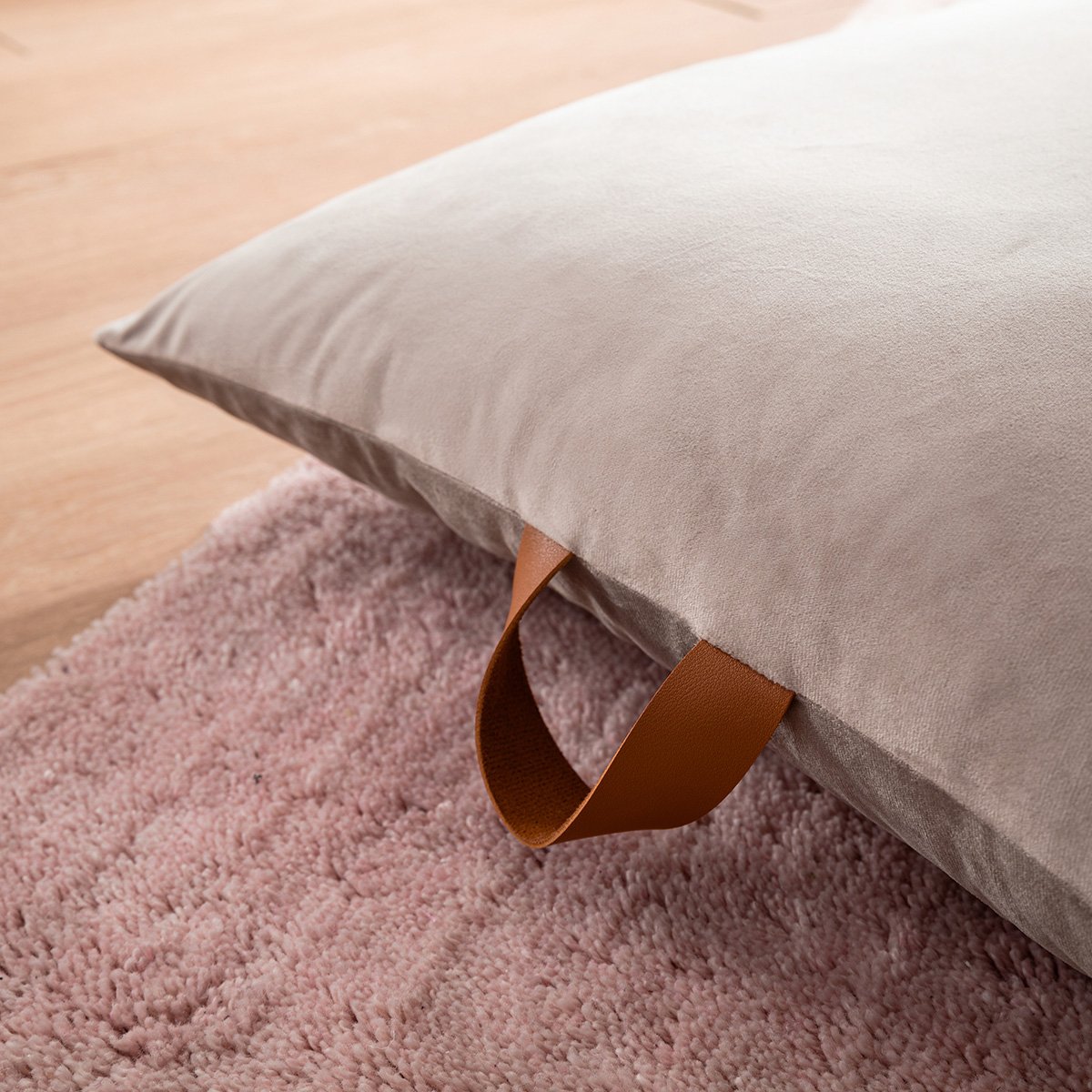 Μαξιλαροθήκη δαπέδου από απαλό, μονόχρωμο βελούδινο ύφασμα και διακοσμητικό χερούλι δερματίνης.