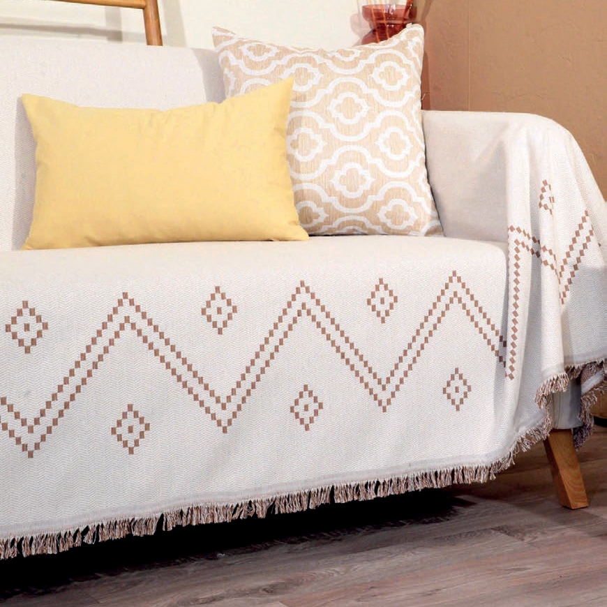 Ριχτάρι καλοκαιρινό διπλής όψης μονόχρωμο, με σχέδιο περιμετρικά. Από βαμβακερά ανακυκλώσιμα νήματα φιλικά στο περιβάλλον και φινίρισμα με ιδιαίτερα απαλή υφή. Διατίθεται σε τέσσερις απαλές αποχρώσεις εκρού, μπεζ, τζιν και σομόν.