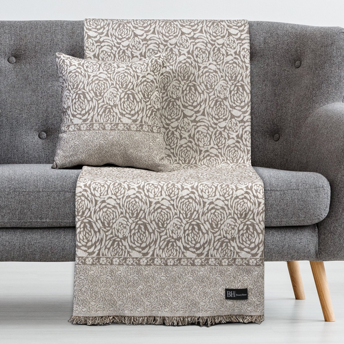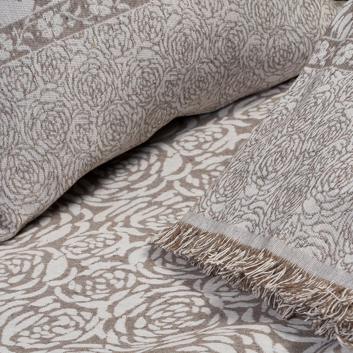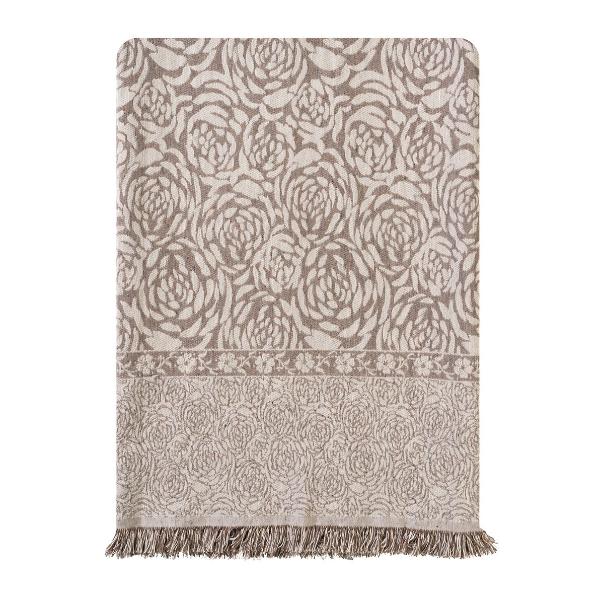 To ριχτάρι Roses είναι δίχρωμο με φλοράλ σχέδιο στην ύφανση του. Διακριτικό κρόσσι 2cm στις δύο πλευρές.