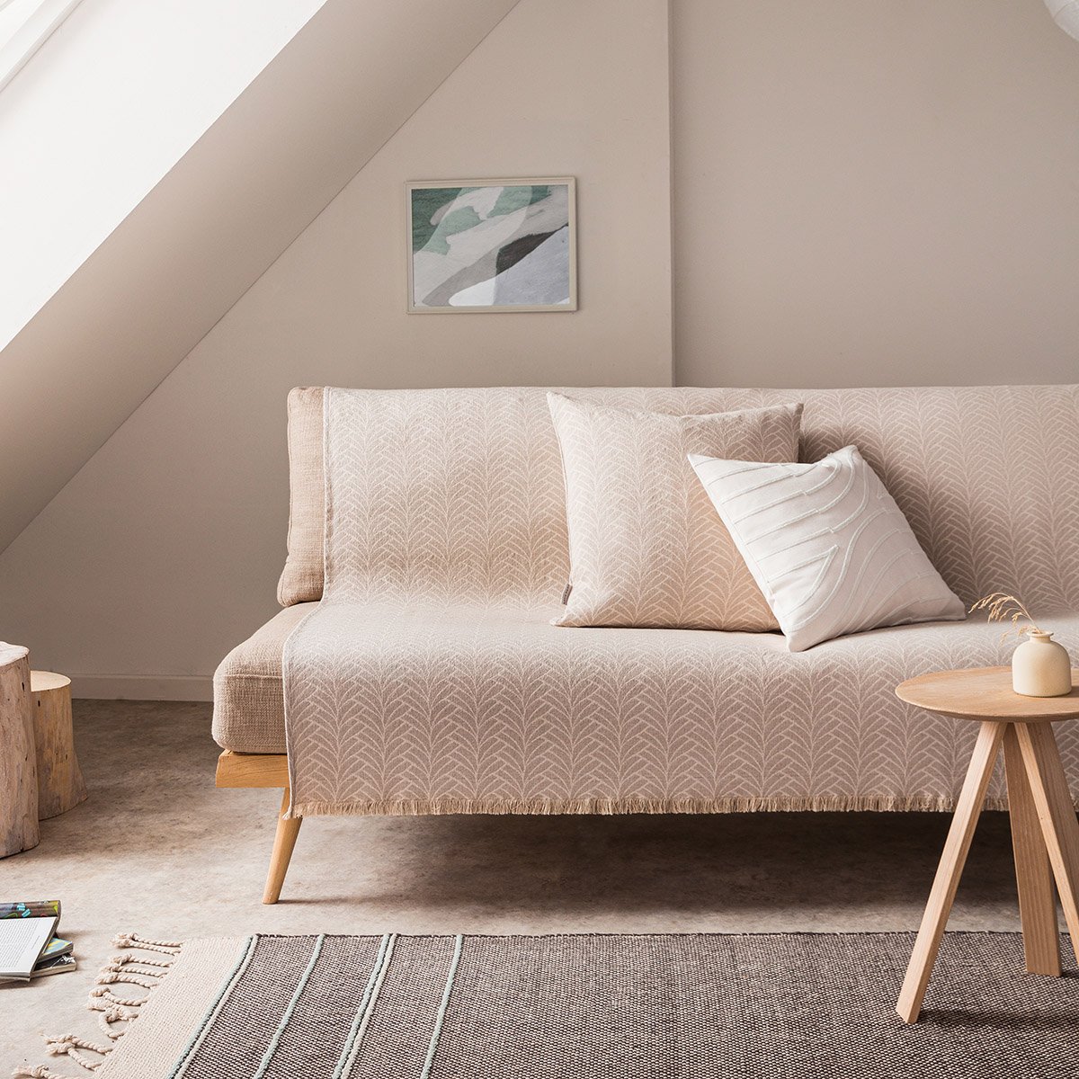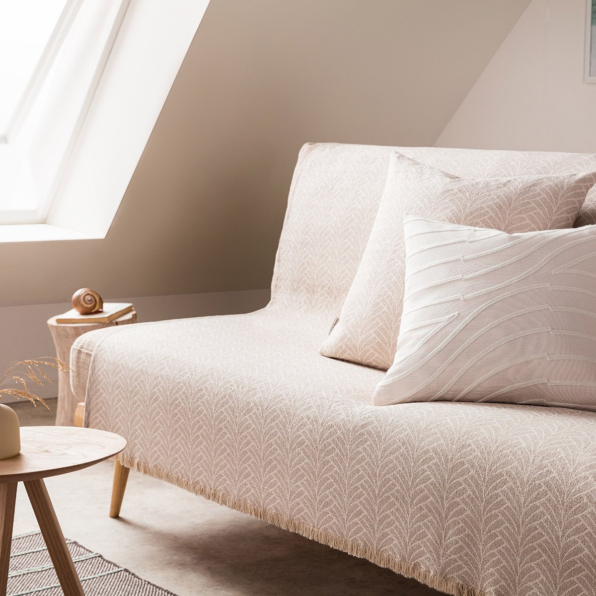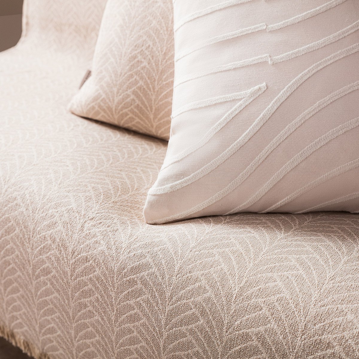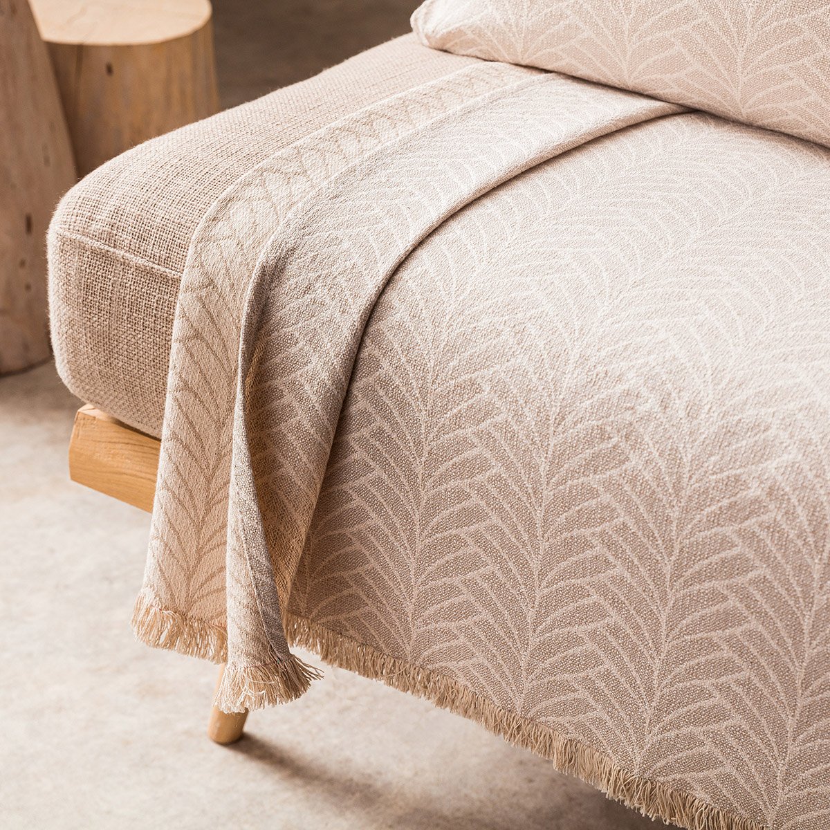 To ριχτάρι Seashell είναι δίχρωμο με σχέδιο art deco στην ύφανση του, διπλής οψης. Κατασκευασμένο από 100% πενιέ βαμβακερά νήματα που αποτρέπουν την δημιουργία κόμπων. Διακριτικό κρόσσι 2cm στις δύο πλευρές.