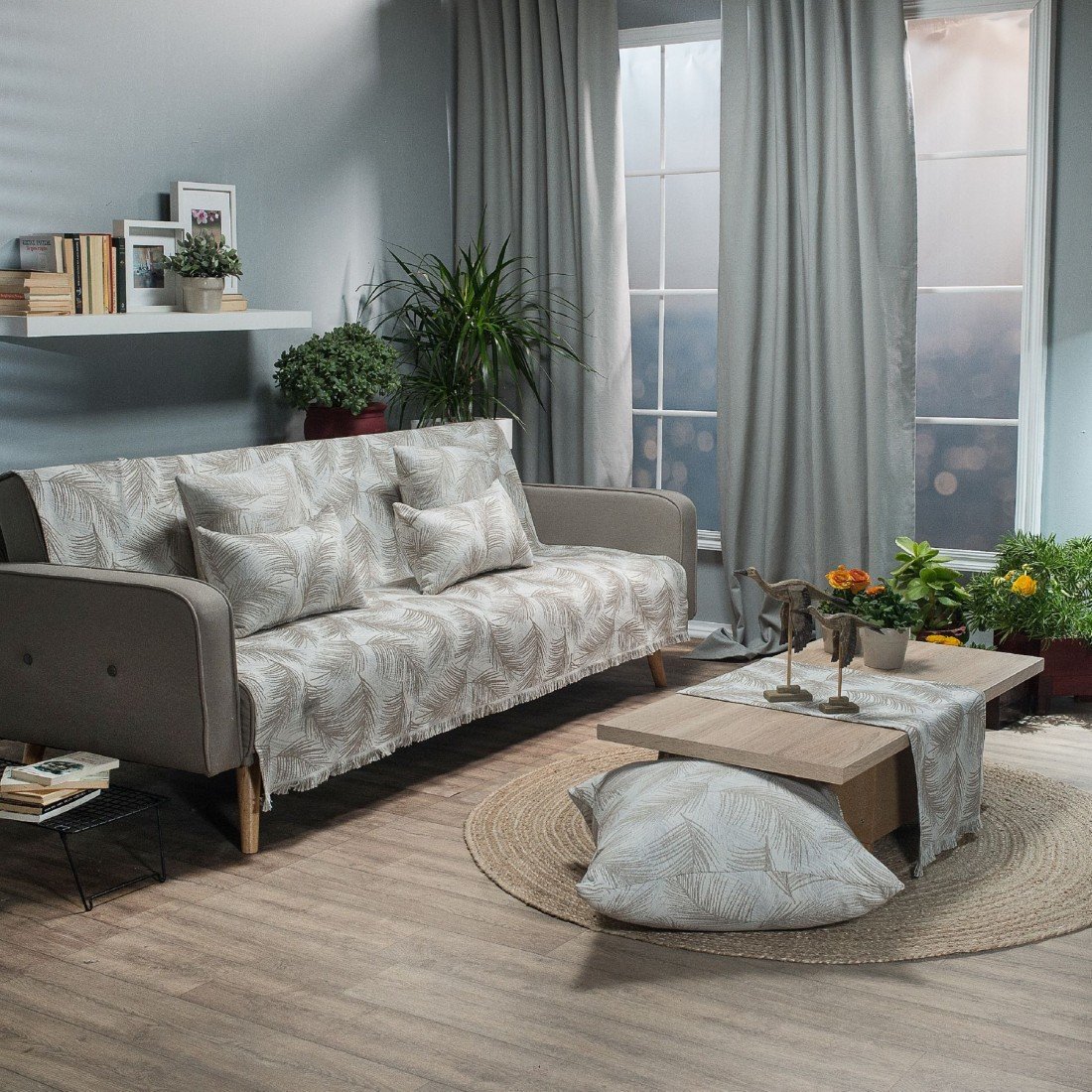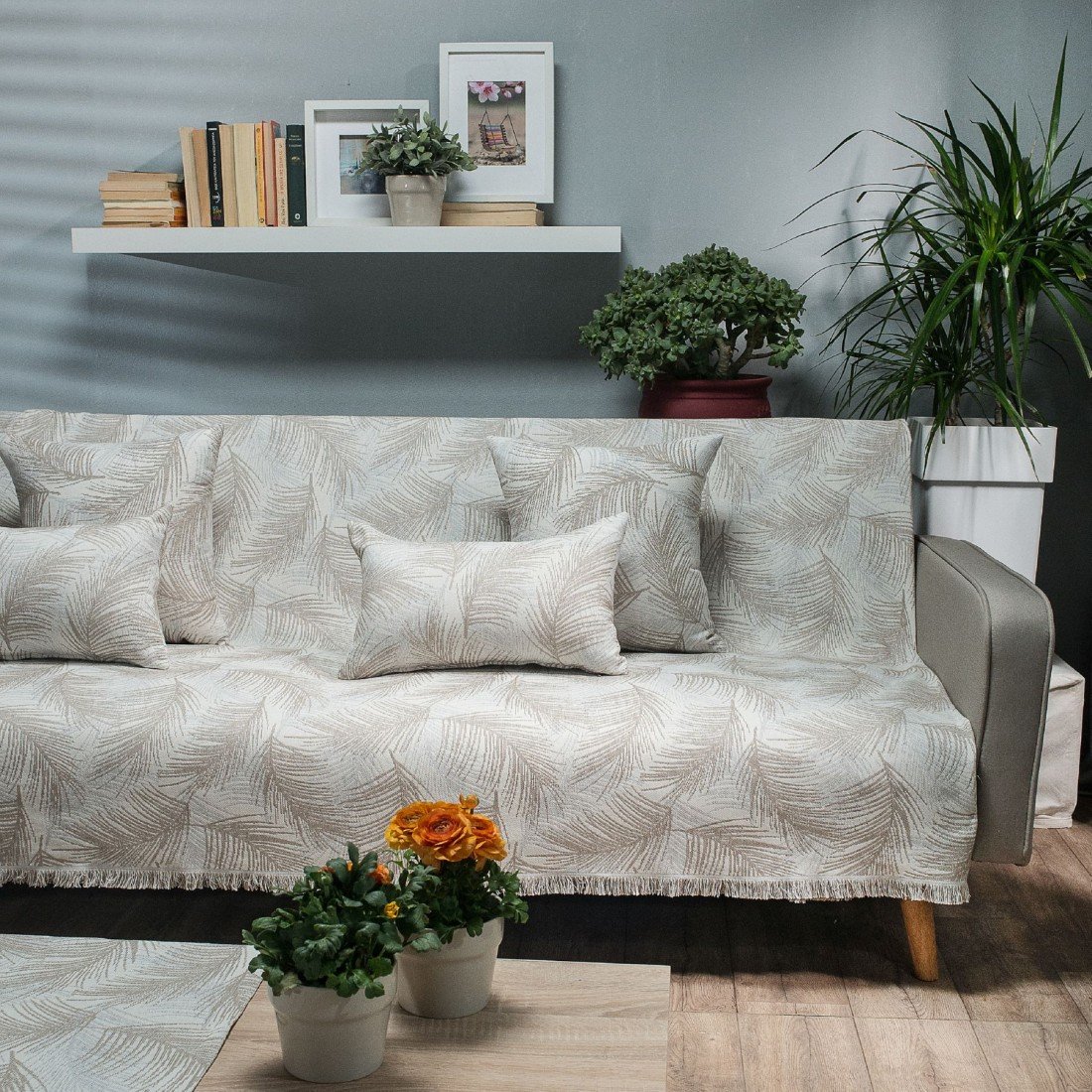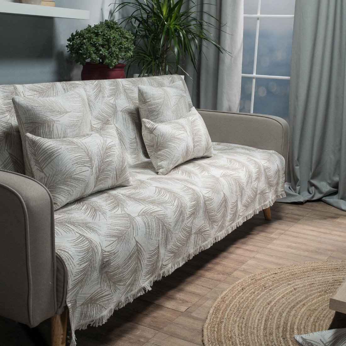 To ριχτάρι Ravela είναι τριχρωμο με φυλλώδες σχέδιο στην ύφανση του. Διακριτικό κρόσσι 2cm στις δύο πλευρές.