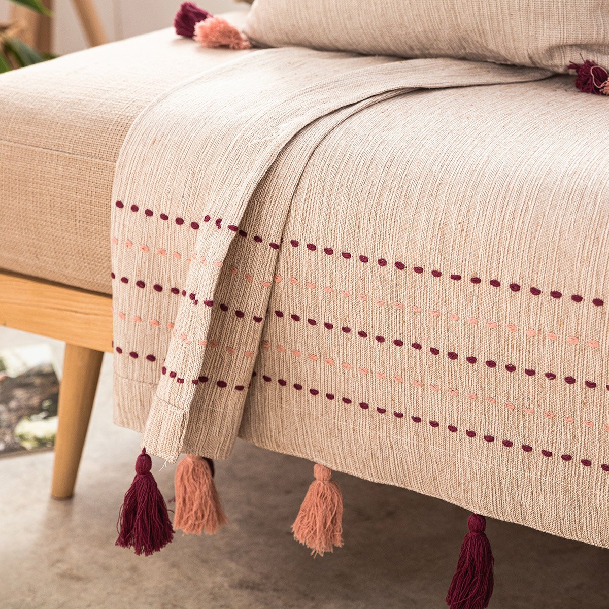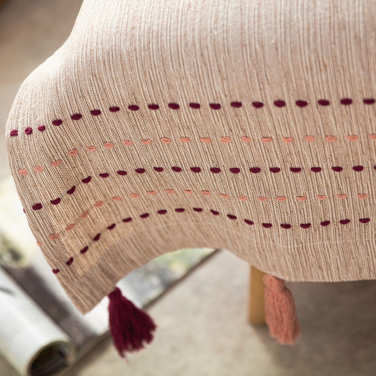To ριχτάρι Trace είναι οικολογικό κατασκευασμένο από 100% ανακυκλώσιμα νήματα με χρωματιστές βαμβακερές φούντες στις δύο πλευρές. Η ύφανση έγινε σε χειροκίνητο αργαλειό και η σχετική ανομοιογένεια στην κατασκευή του είναι αναμενόμενη.