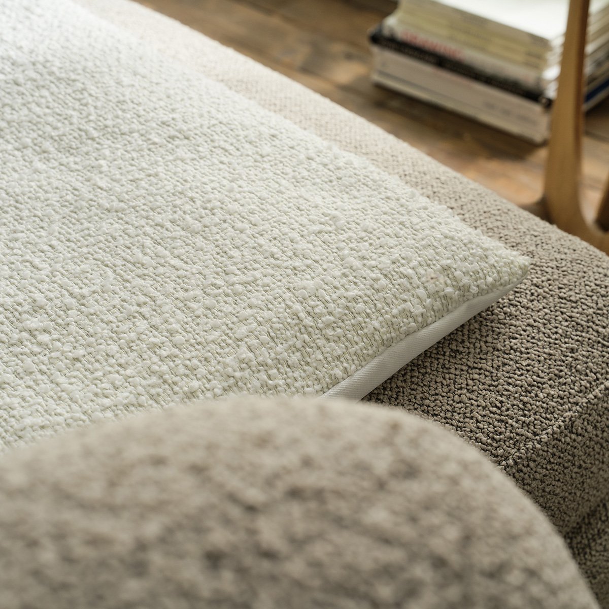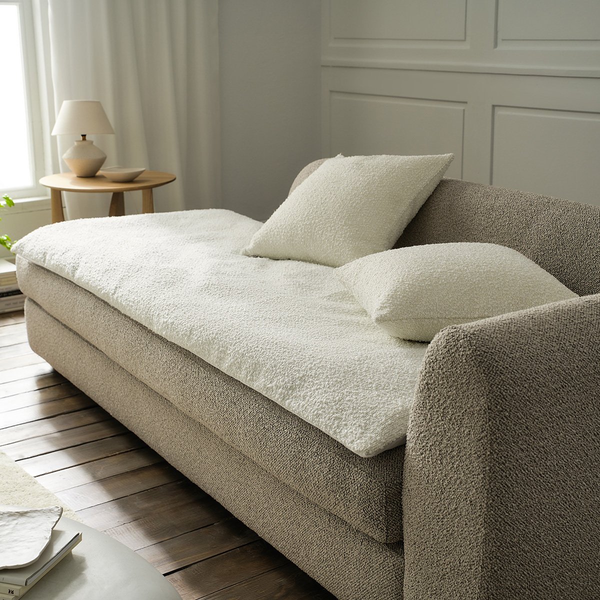 To sofa quilt της εταιρείας Gofis από μπουκλέ ύφασμα έρχεται να ανανεώσει το χώρο σας. Πιο συγκεκριμένα, αποτελεί top επιλογή για να τολμήσετε μια στιλιστική αναβάθμιση στον καναπέ ή σε οποιονδήποτε άλλο χώρο του σπιτιού σας , εξασφαλίζοντάς σας άνεση καθώς βλέπετε τηλεόραση ή χαλαρώνετε.