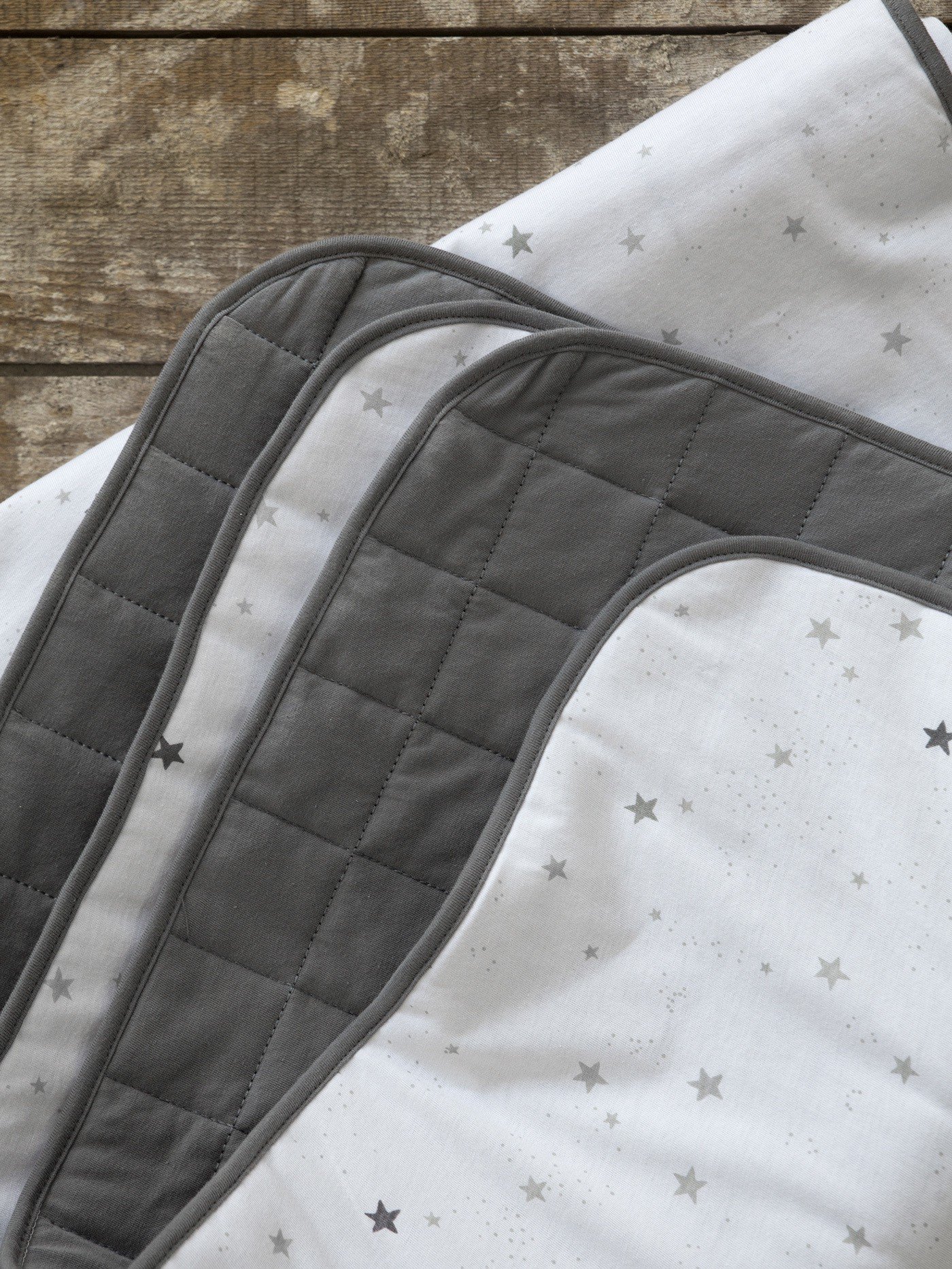 Κουβερλί κούνιας της σειράς Nene σε γκρι/ λευκό χρώμα από την εταιρεία Nima Home. Στη μία όψη του είναι διακοσμημένο με τα πιο γλυκά αστεράκια σε τυπωτό σχέδιο και στην άλλη του όψη είναι μονόχρωμο, σε ανοικτό γκρι χρώμα, ώστε να επιλέγετε την πλευρά που σας αρέσει κάθε φορά, δημιουργώντας ένα δωμάτιο γεμάτο γλυκύτητα και θαλπωρή. Το μοντέρνο και ουδέτερο χρώμα του είναι ιδανικό για να ντύσετε ένα αγορίστικο ή κοριστίστικο βρεφικό δωμάτιο.