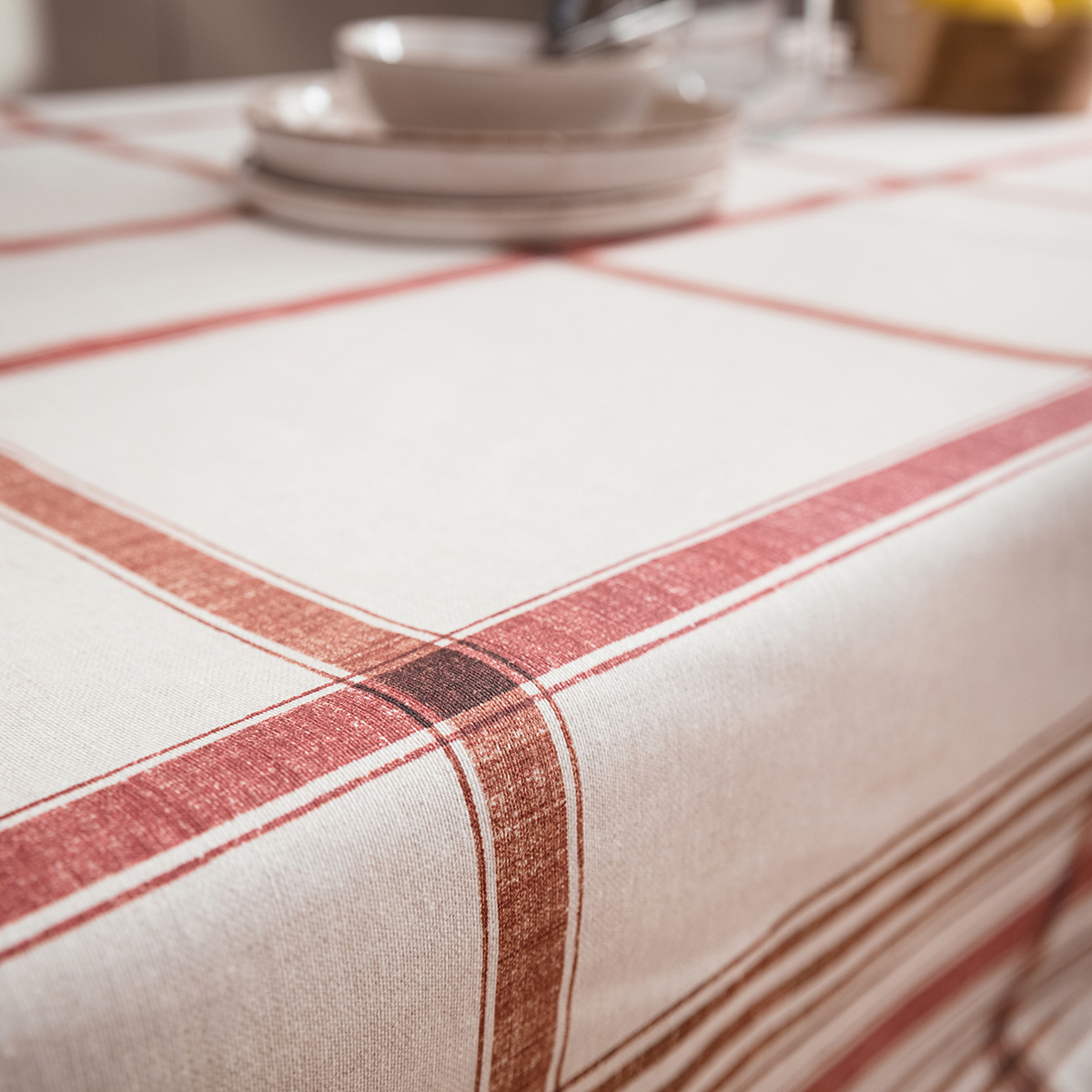 Τραπεζομάντηλο αλέκιαστο με ειδικό φινίρισμα υφάσματος, τύπου RESINA, που κρατά μαλακό το ύφασμα αλλά μπορεί και απωθεί τους λεκέδες. Τυπωμένο με ανεξίτηλα ανθεκτικά χρώματα.